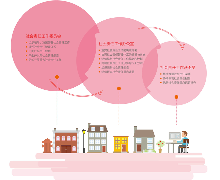 CMEC成立以董事长为主任、总裁为执行主任、各职能部门和事业部总经理为委员的社会责任工作委员会,负责统筹、规划和协调公司全面社会责任工作;委员会下设社会责任工作办公室,设在战略与经营发展部,负责委员会的决策落实和日常工作;各职能部门和事业部建立社会责任工作联络员,负责实施和完成本部门或单位企业社会责任管理的相关工作。
